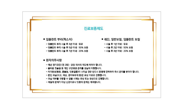 임플란트 정기검진 안내 및 진료보증제도를 통한 사후관리 시스템으로 임플란트를 오래 사용할 수 있도록 도와드립니다.