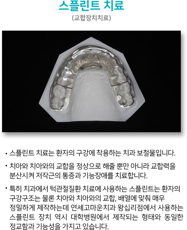 이갈이는 턱관절 질환의 원인일 뿐 아니라 치아의 마모를 가져옵니다. 이갈이가 심한 경우 오전에 일어났을 때 턱관절 통증이 심한 특징이 있습니다. 이 경우 야간에 끼고 자는 장치치료로 증상을 줄일 수 있습니다.